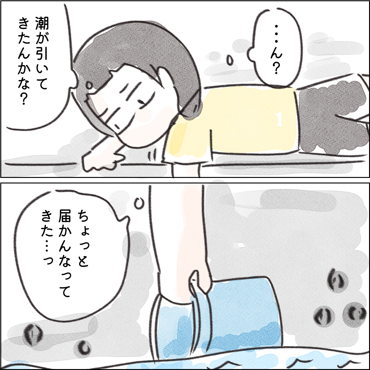 その頃には少し潮が引いていたのか、無理してすくおうとした瞬間、バランスを崩して海に落ちてしまった魚田コットンさん…!海中から目に映ったのは、水面と岸壁、そして慌てて走ってくる友達の姿でした。その友達に引っ張り上げてもらい“九死に一生を得た”のでした。