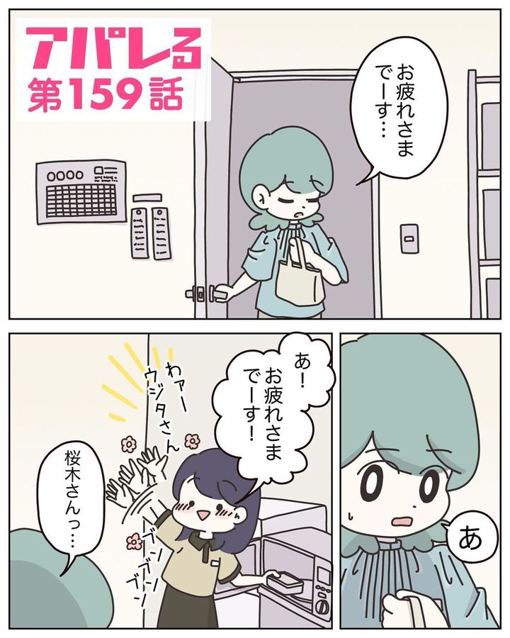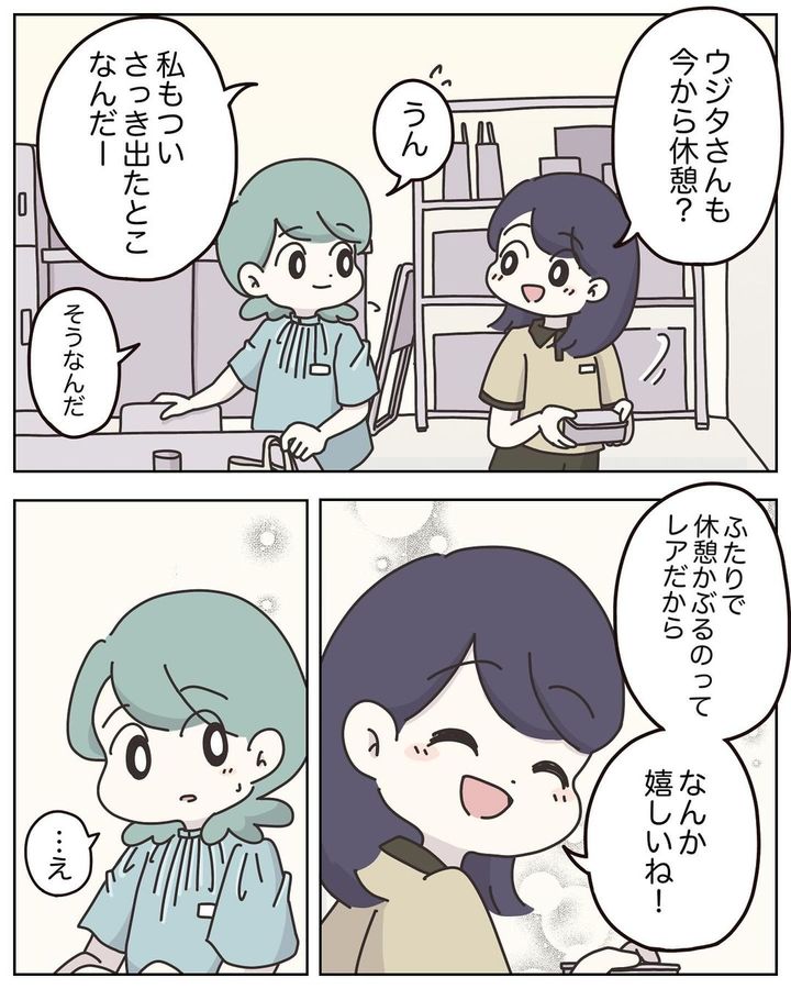スージーさんから「あなた桜木さんと同期じゃなかった?」「もっと彼女に負けないよう」などと言われ、肩を落としてしまうウジタさん。浮かない顔で休憩室に移動すると、桜木さんと遭遇!笑顔で話しかけてくる桜木さんに、モヤモヤとしながら反応します。