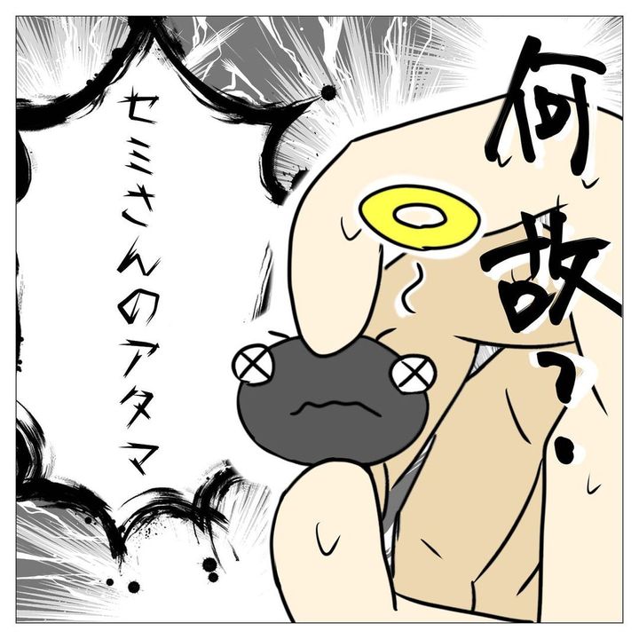 夏の夜、洗濯物を取り出していると中から何やら硬い感触が…!「普通洗濯機からそんな音する?」と恐る恐る“音の正体”を取りだしてみると…。中からは、頭だけになったセミの死骸が…!「あぎゃ」と叫び声を出し、セミの頭を投げるあにらむさんなのでした。