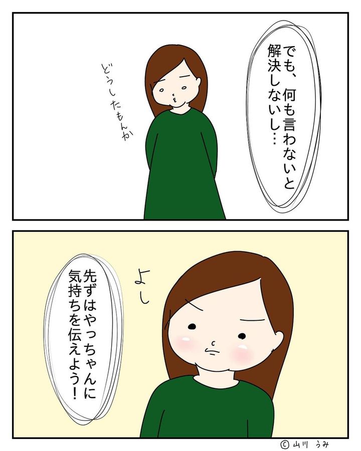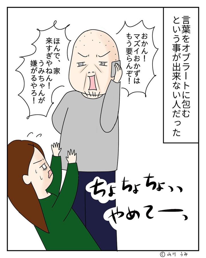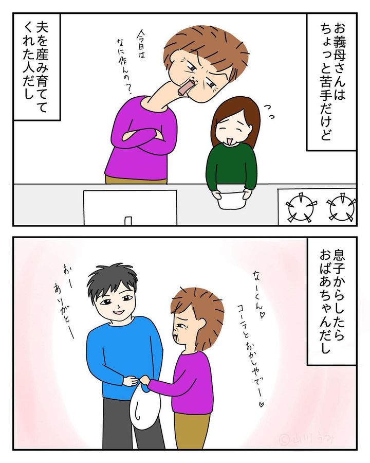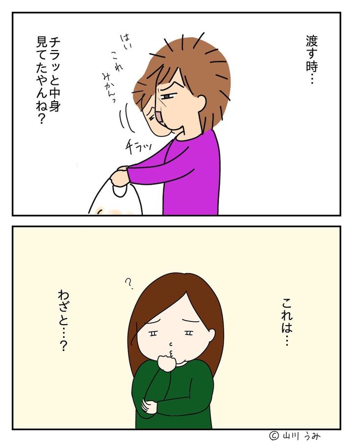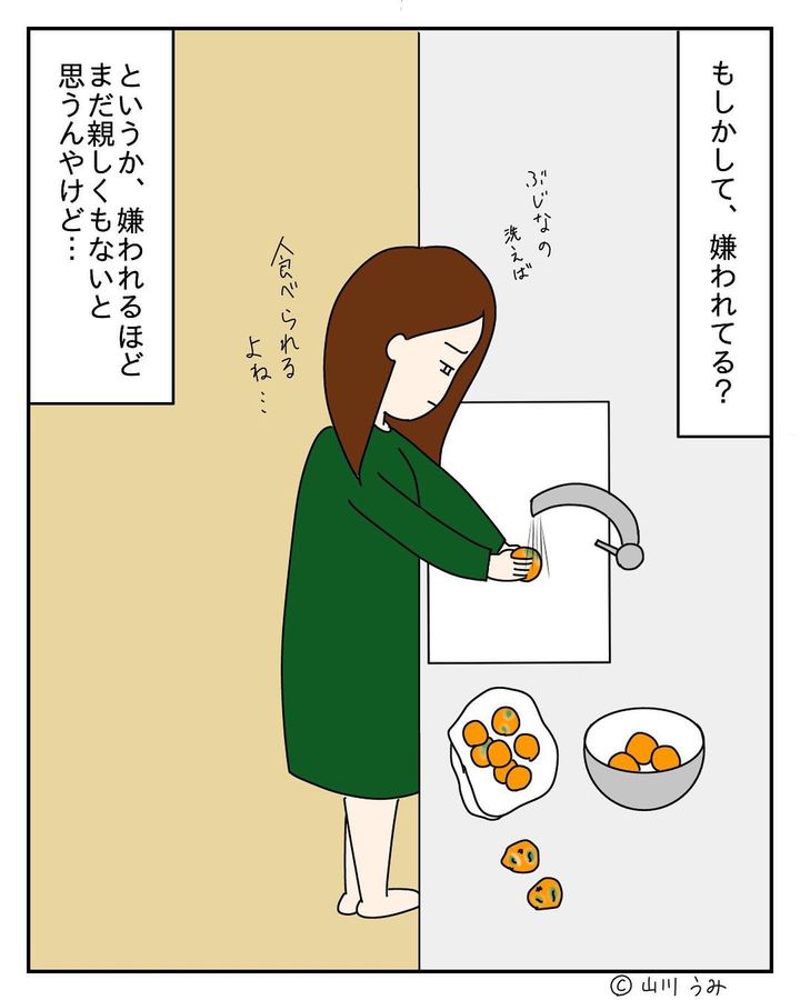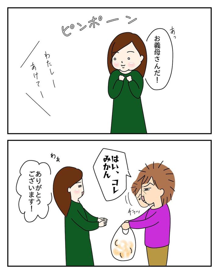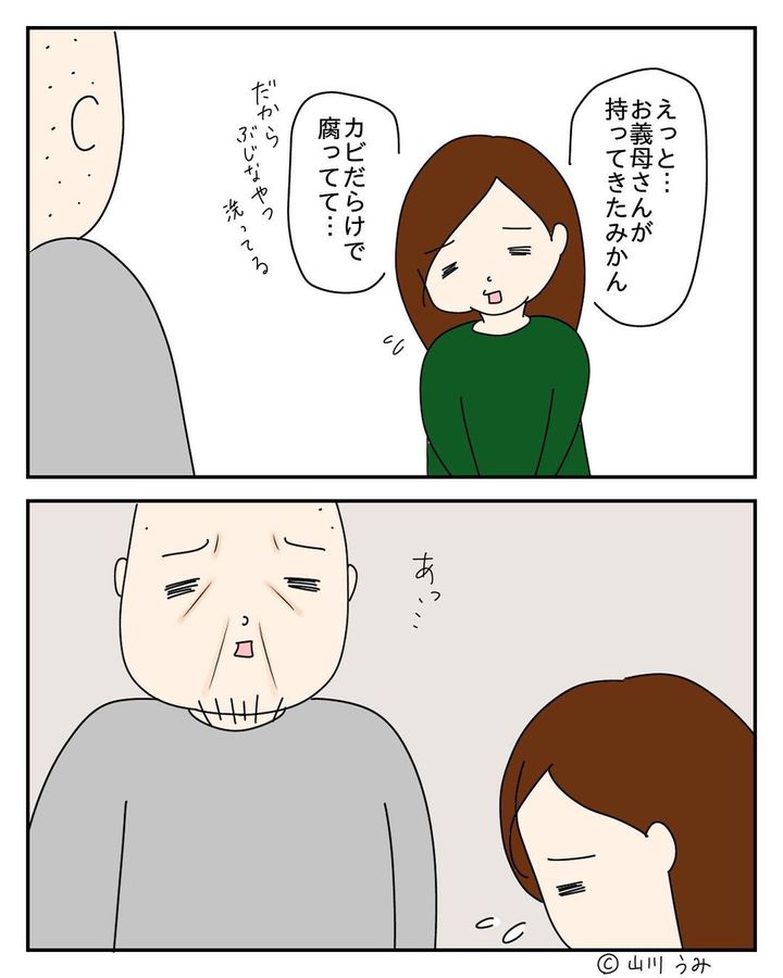 頻繁に家に来る義母にうんざりするうみさん。友人に相談してみたところ、仲良くなりたいのでは、と言われて仲良くする努力をしようと決意します。そんな折、義母が訪れてみかんを届けてくれます。感謝を伝えて、みかんを貰ったことをうれしく思いますが、よく見てみると腐ったみかんを渡されたのでした。夫のやっちゃんに相談し、義母が頻繁に来訪することを止めてもらおうとしますが、「おかん!マズイおかずはもう要らんぞ!」とあまりにもストレートに言ってしまうのでした。