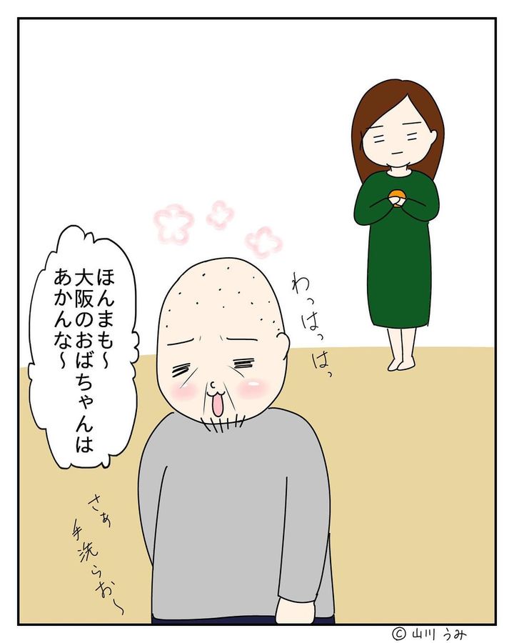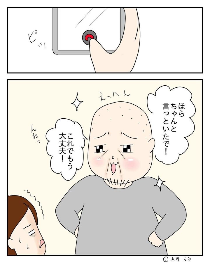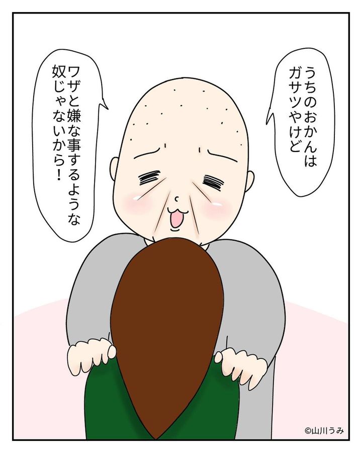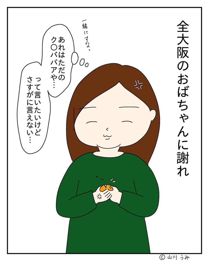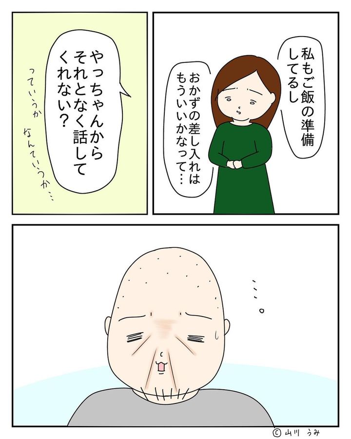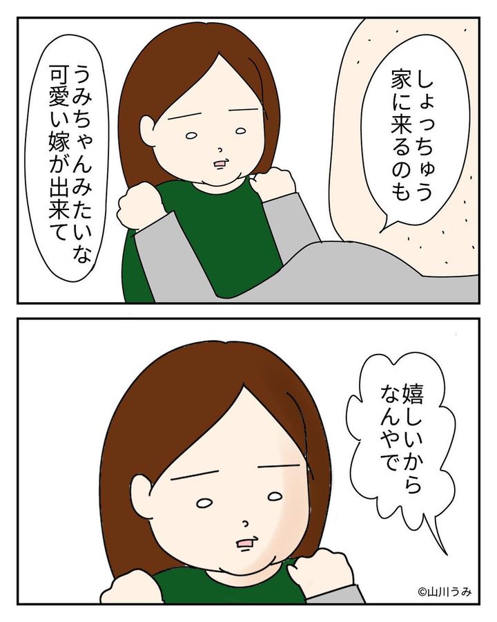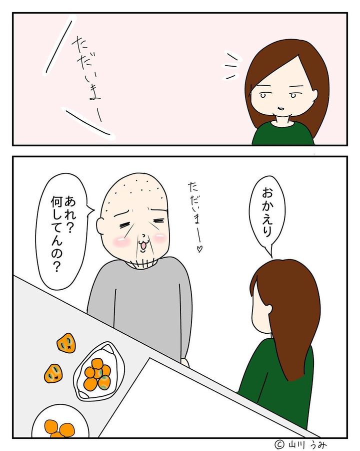頻繁に家に来る義母にうんざりするうみさん。友人に相談してみたところ、仲良くなりたいのでは、と言われて仲良くする努力をしようと決意します。そんな折、義母が訪れてみかんを届けてくれます。感謝を伝えて、みかんを貰ったことをうれしく思いますが、よく見てみると腐ったみかんを渡されたのでした。夫のやっちゃんに相談し、義母が頻繁に来訪することを止めてもらおうとしますが、「おかん!マズイおかずはもう要らんぞ!」とあまりにもストレートに言ってしまうのでした。
