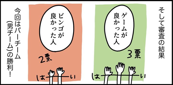 挙手で投票した結果、男子チームが良かったと思う人3票・女子チームが良かったと思う人2票となり、僅差で男子チームの勝利となりました!
