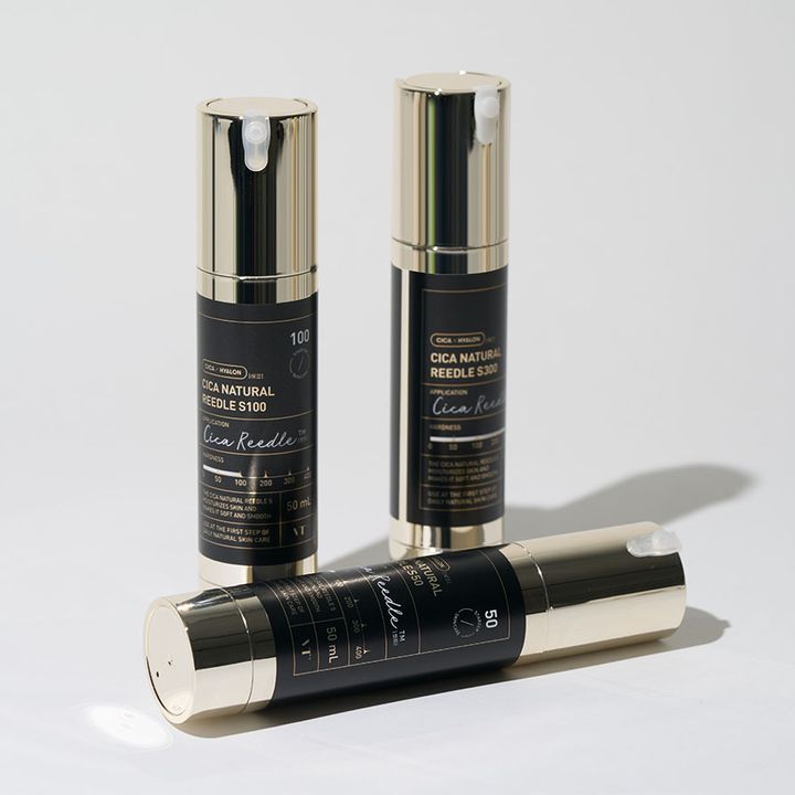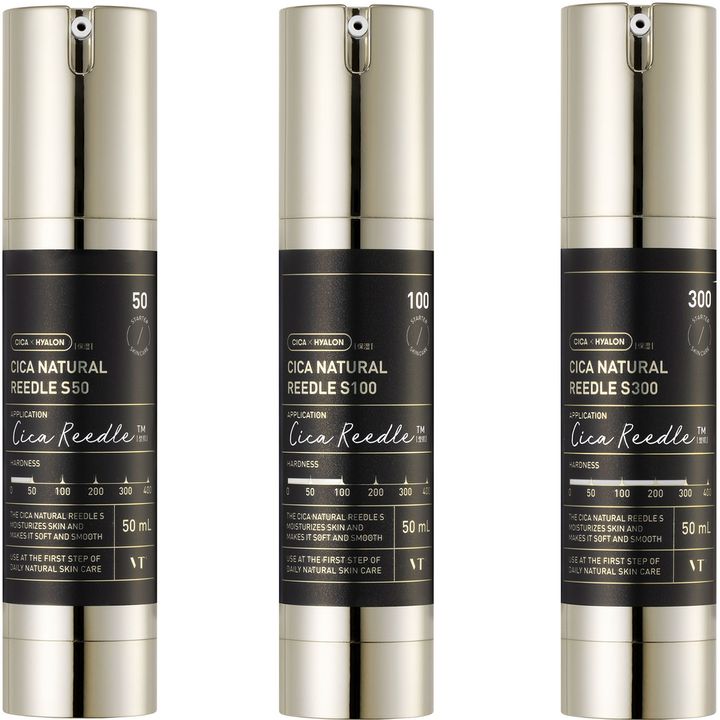 左:3アイテムの中で最も低刺激タイプ。シカナチュラルリードルS 50 50ml ¥3,270、中:シカナチュラルリードルS 100 50ml ¥3,820、右:3アイテムの中で最もCICA REEDLE配合量が多い。シカナチュラルリードルS 300 50ml ¥5,030(すべてVT COSMETICS)
