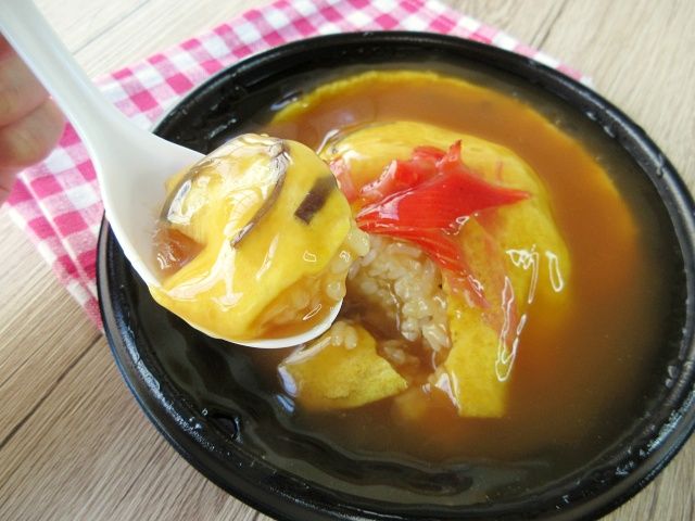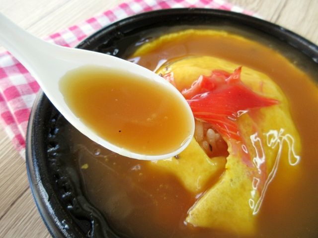 あんの量がたっぷりで天津飯が沈んで見えますね。商品名の通り、あんの海におぼれているかのよう。手で持ち上げた際には、ずっしりとした重量感が伝わってきました。ボリュームは満点です。