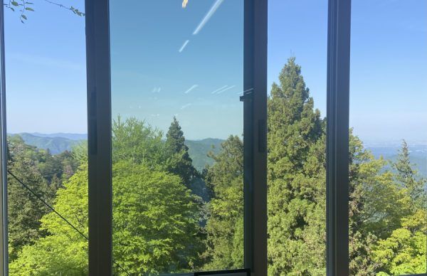 お店の奥の一面はガラス戸になっており、きれいな山々が望めます。空いていればその奥の席がおすすめです。