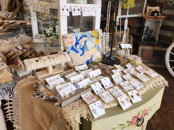 手作りのヘアアクセサリーやイヤリング・ピアスなどのアクセサリーが置いてあり、作家さんによってそれぞれ違いがあり、どれも欲しくなってしまいました。