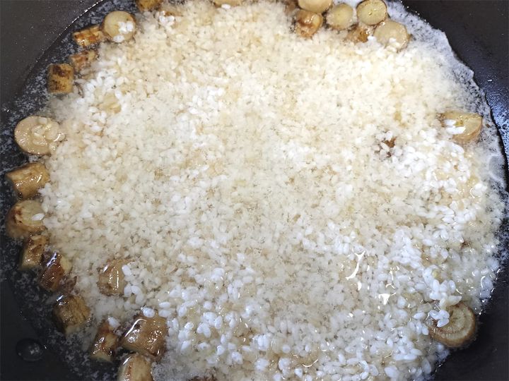 3. 焼き色がついたら一度火を止め、漬けておいた米を昆布だしごと入れます。