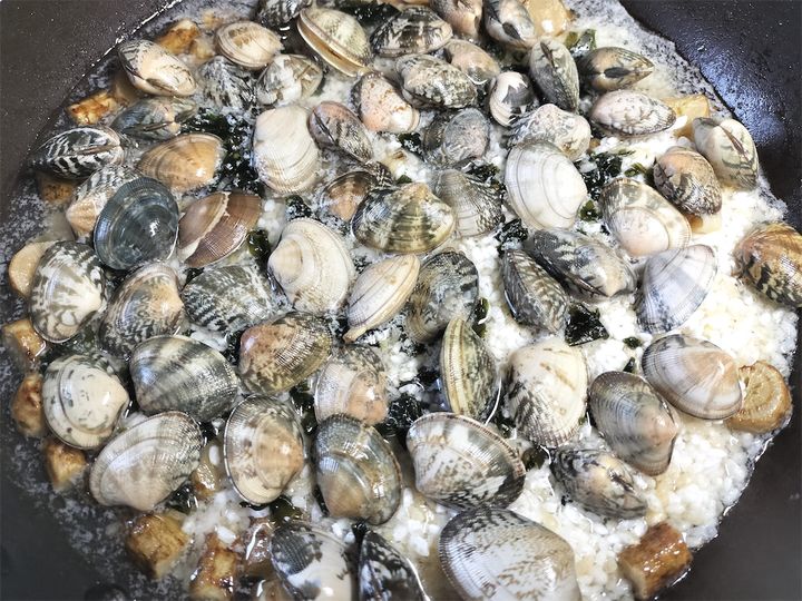 4. わかめを入れて軽く混ぜ、その上にアサリをそっと乗せていきます。そのまま強火にかけ、グツグツと沸騰したら弱火にして、フタをして15分煮ます。