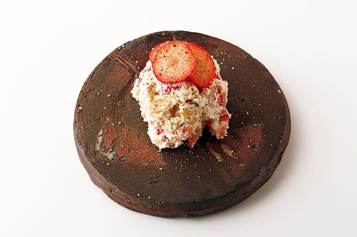 カッテージチーズにサワークリームを混ぜたリコッタ風のチーズに、いちごの酸味とナッツのコクが混じり合ったスイーツ風の一品。甘味のある白味噌を隠し味にして、黒胡椒で味を引き締め、日本酒を呼ぶ味わいに仕上げた。