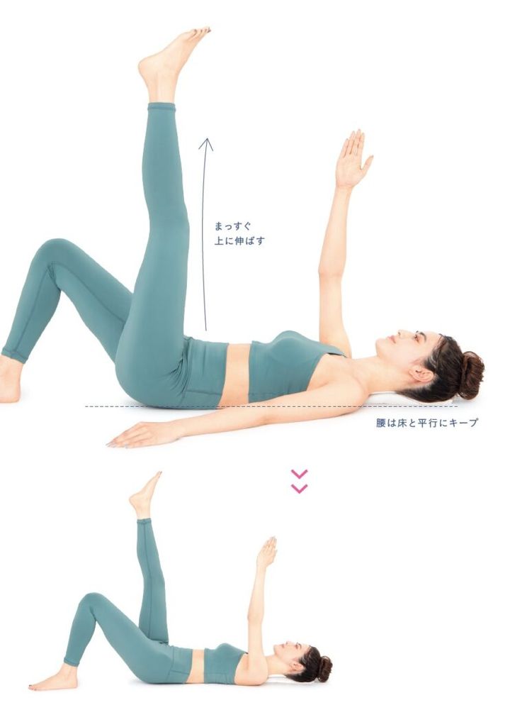 1、基本姿勢の状態で息を吸い、吐きながら右腕と左脚をまっすぐ上に伸ばす。腰のS字ラインをフラットにするイメージで床に押し付けて。