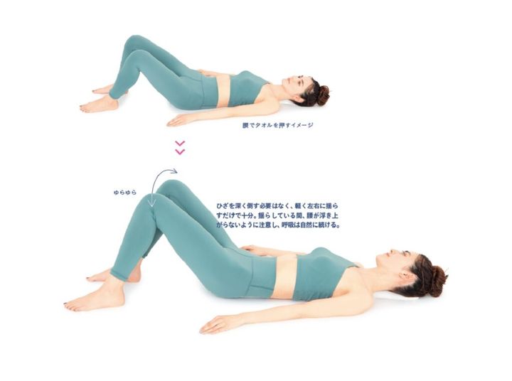 2、ひざを深く倒す必要はなく、軽く左右に揺らすだけで十分。揺らしている間、腰が浮き上がらないように注意し、呼吸は自然に続ける。
