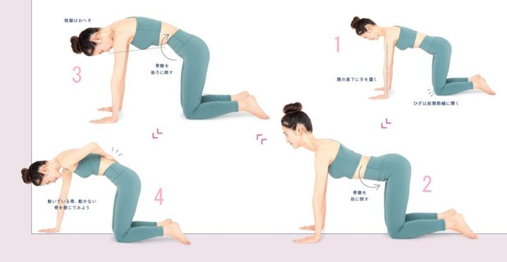 1、肩の真下に手、股関節の真下にひざを置いて四つん這いになる。後頭部から仙骨までをまっすぐに。