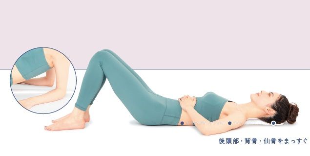 バスタオルを細く長く丸め、その上に後頭部、背骨、仙骨を乗せて仰向けになる。両ひざを立て、足とひざの間はほんの少し開ける。