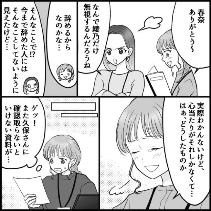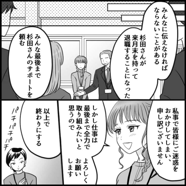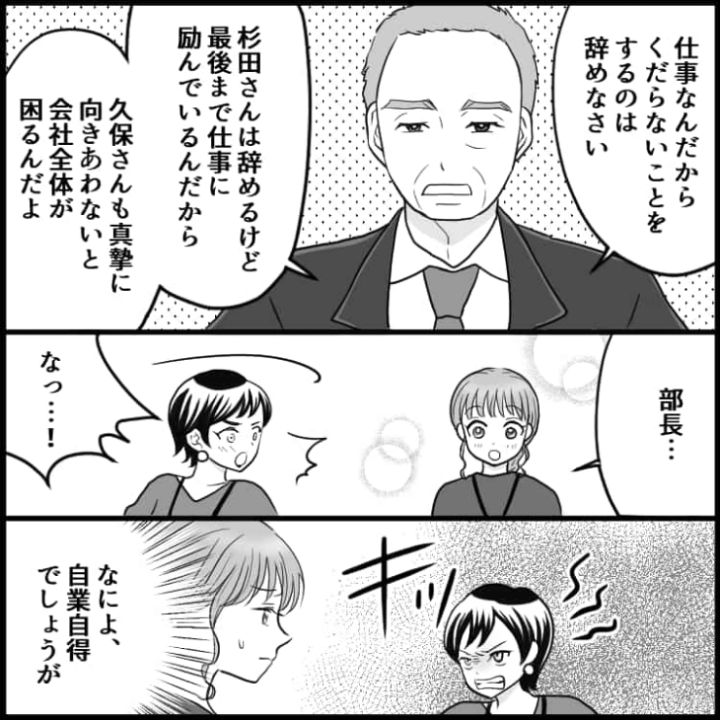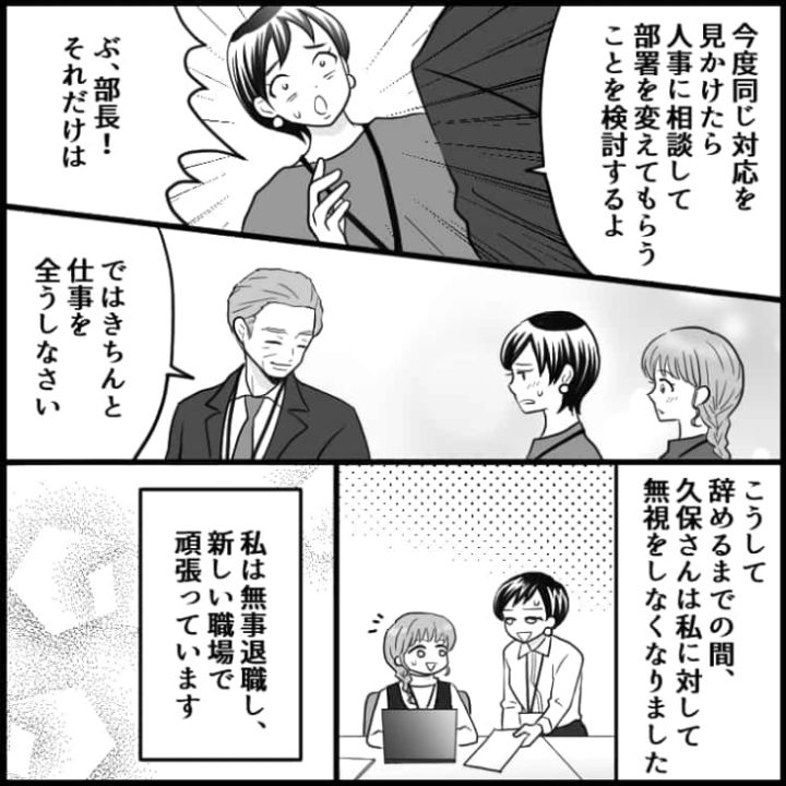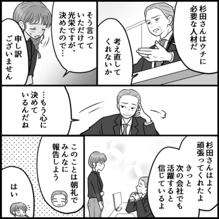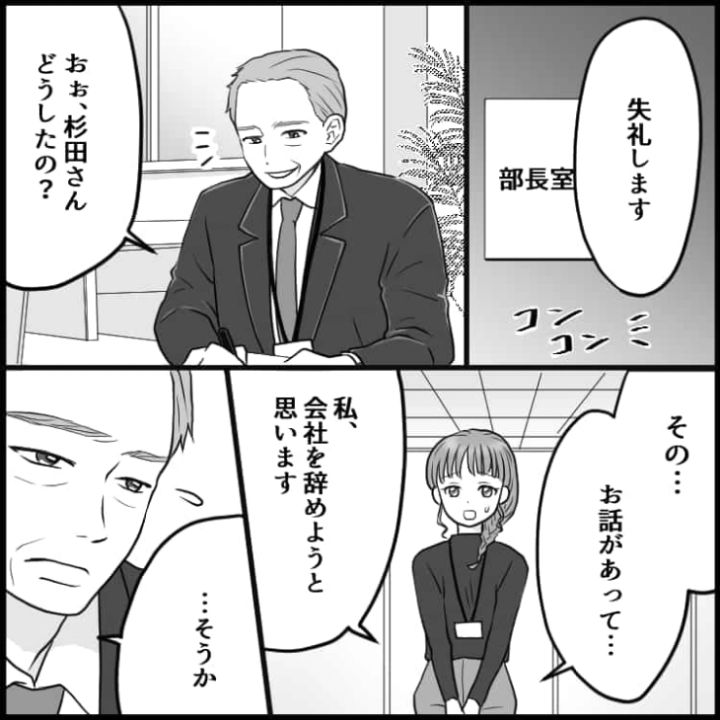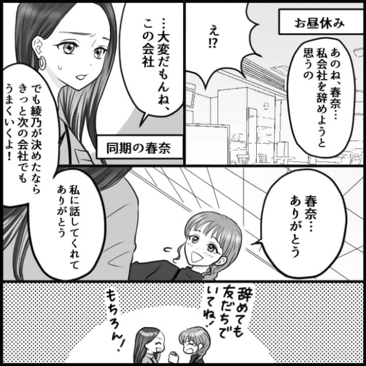退職の報告をきっかけに嫌がらせを受けてしまった主人公でしたが、上司の助けを借りなんとか退職まで漕ぎ着けました。会社で困ったことがあったら友人に愚痴を言うだけではなく、頼れる上司に相談するのが解決への道になりそうですね。
