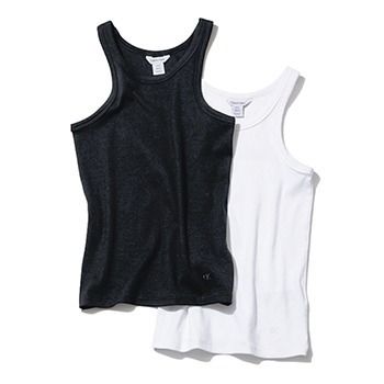 タンクトップ /カルバン・クライン(カルバン・クライン カスタマーサービス) 「肌が潔く出ていることがポイントとなり、1枚でさまになるタンクトップはまめに買い足す服のひとつです。デザイン性の高いアメスリだと、アクセなしでも凝った印象に」(樋口さん)