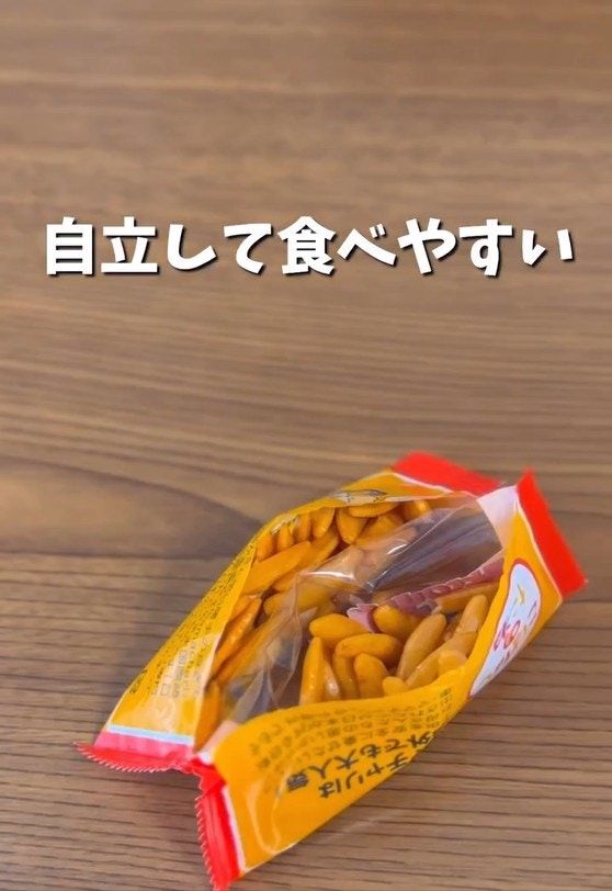 すると、中身がこぼれることなく開封でき、袋を立てて食べることができるので便利です。
