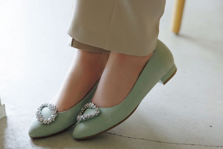 ベーシックカラーでまとめた着こなしの足元は、きれいめヒールだと地味見えしたり、逆にドレッシーすぎる印象に。今のイチ押しは、デコラなぺたんこ靴♡ 可憐なミントのビジュー靴で、ベージュの持つ柔らかな雰囲気を引き立てつつ、華やかさも携えて。