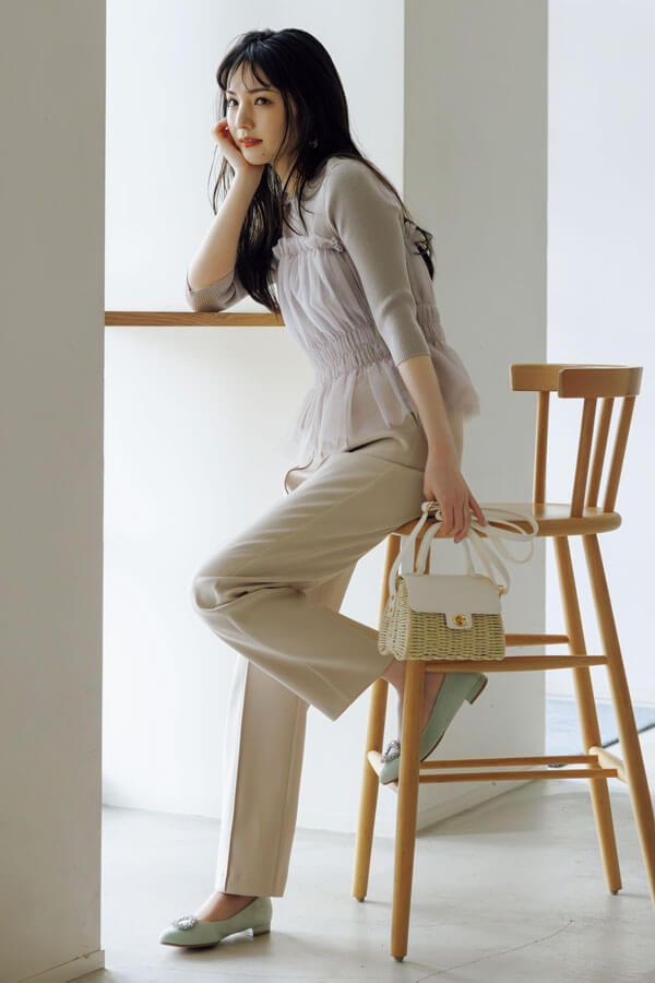 フラットシューズ(H1.5cm)¥24,200/銀座かねまつ(銀座かねまつ6丁目本店) チュールニット¥16,500/アプワイザー・リッシェ タックパンツ¥11,000/Noëla バッグ¥3,958/grove(ワールドプレスインフォメーション)