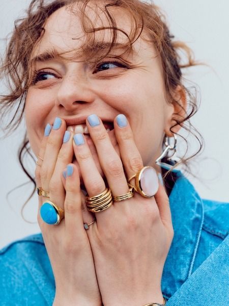 イヤリング 6,600円/loni ピンクストーンリング、ブルーストーンリング 各32,120円/ともにマルシア・モラン、5連風ゴールドリング(左手・薬指) 25,080円/ソコ(以上ZUTTOHOLIC) ゴールド×楕円ストーンリング(左手・中指) 28,600円、スクエアストーン×ゴールドリング(右手・中指) 26,400円/ともにテンプル オブ ザ サン(ジャック・オブ オール・トレーズ プレスルーム) オパールスクエアリング(左手・小指) 23,100円/Jouete 2連リング(右手・人さし指) 45,100円/e.m.(e.m. 青山店) デニムジャケット 12,650円/ビーミング by ビーミング(ビーミング ライフストア by ビームス ららぽーとTOKYO-BAY店)