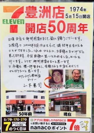 50周年企画の案内チラシに、山本オーナーのコメントと共に、50年前の写真が掲載されていました。日本1号店のセブン‐イレブンとして、TVなどのメディアでも見たことがあるお馴染みの写真です。