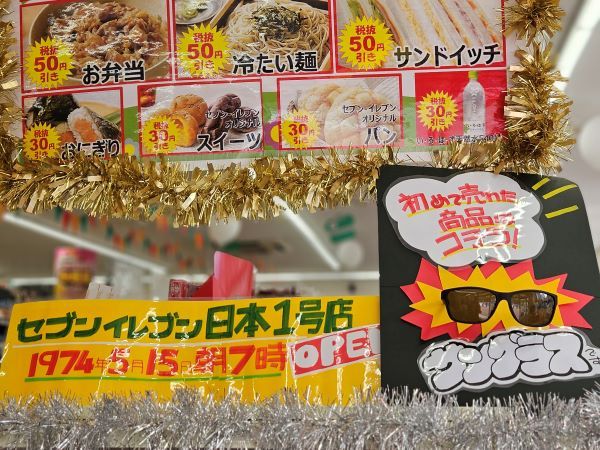 店内も華やかに装飾されていて「セブン‐イレブン日本1号店で初めて売れた商品がサングラスだった」というポップが飾られています。