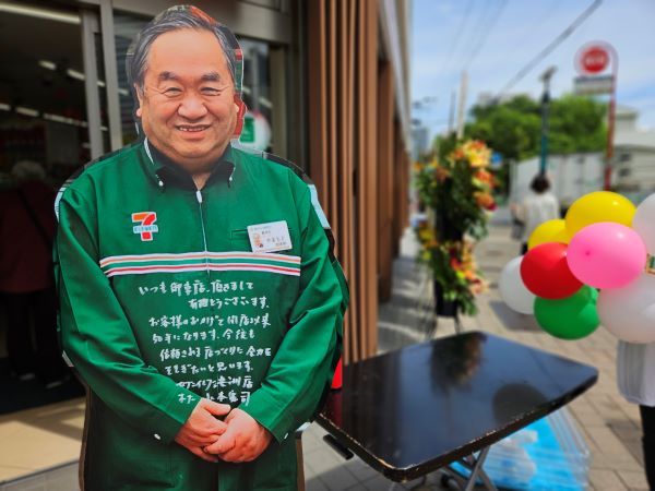 日本初の本格的コンビニエンスストアとして1974年にオープンした、セブン‐イレブン第1号店である豊洲店が2024年5月15日で50周年を迎えました。おめでとうございます。 店頭には多くの花が飾られ、豊洲店オーナー山本憲司氏の等身大パネルも登場!メッセージが添えられていました。