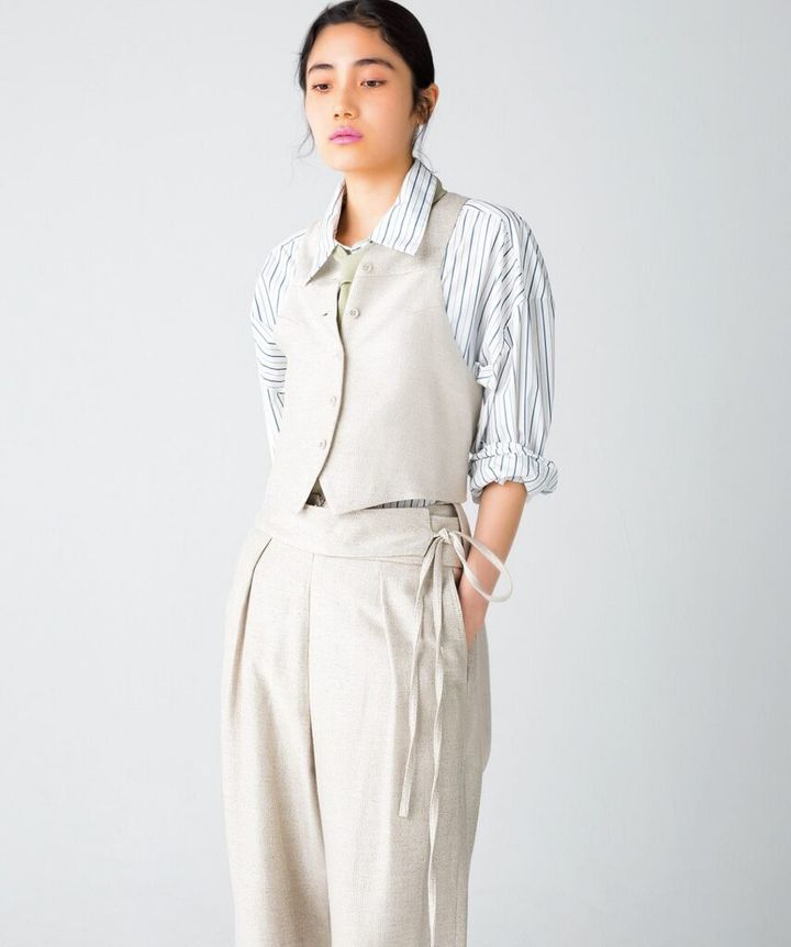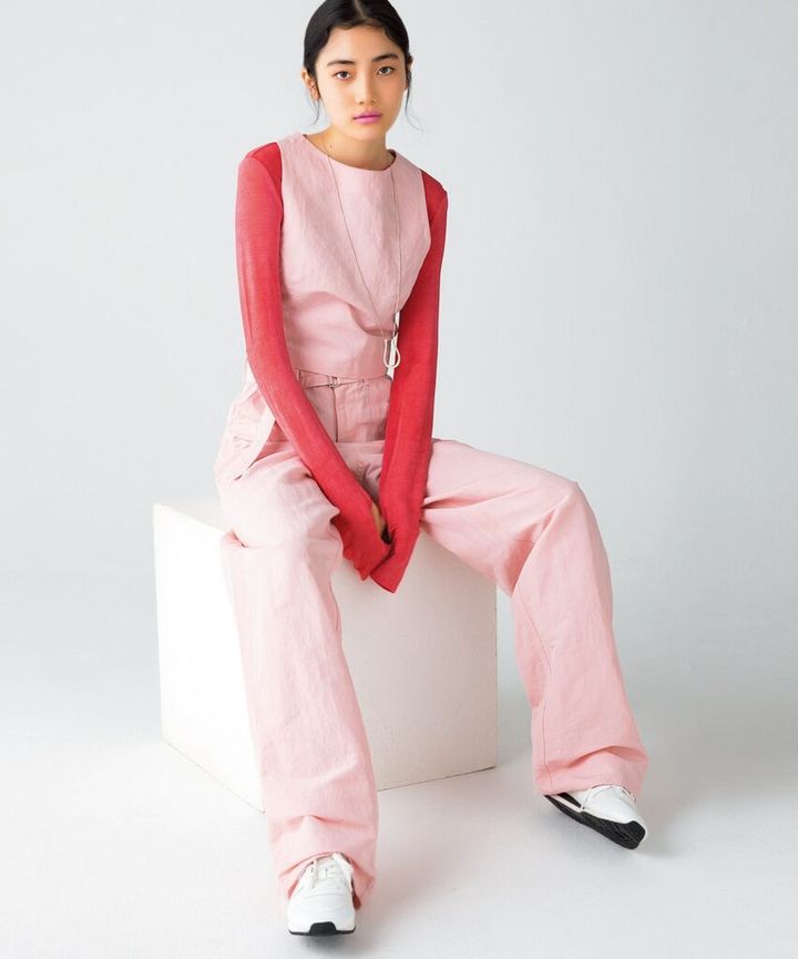 シャリ感のあるリネンコットン素材。大胆なクロスストラップでバックスタイルもキュート。タンク¥30,800 パンツ¥41,800(共にオーラリー TEL:03・6427・7141) 中に着たトップス¥12,100(アモーメント cs@amomento.jp) ネックレス¥46,200(ボーニー/エドストローム オフィス TEL:03・6427・5901) スニーカー¥26,400(ノヴェスタ×ザ ライブラリー/ザ ライブラリー 表参道店 TEL:03・3470・2151)