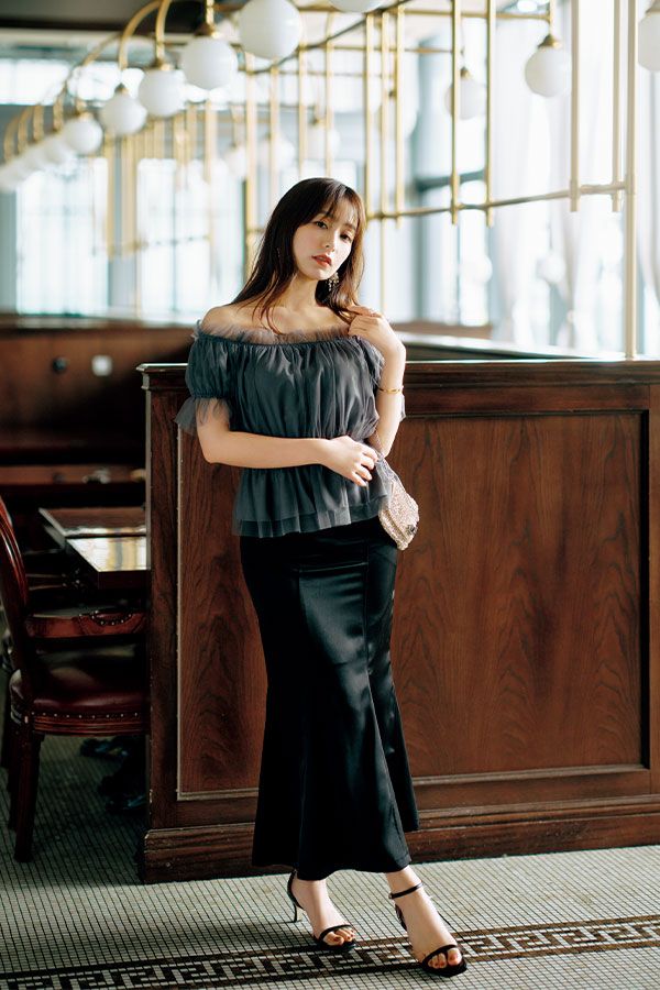 肩を出したりくびれを強調したり、女っぽさを出し惜しみしないスタイルが華やかさん向けデートコーデ。大人の品格を両立するコツは、色みを欲ばらずシックにまとめること。