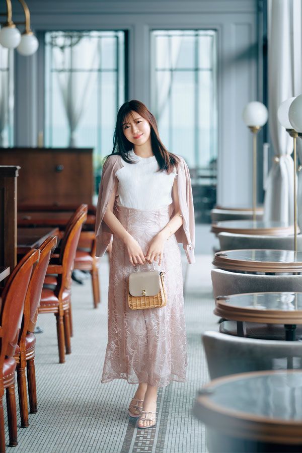 ピンクやグレーなどの中間色に白を合わせて、優しげかつ清楚に。コンパクトなトップスと、レースやチュールのスカートでつくるフィット&フレアのシルエットが鉄板。
