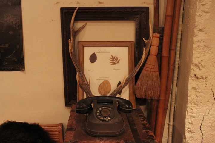アフリカのお面や民芸品、古くて珍しい電話、時計など、いろいろなものが飾られています。
