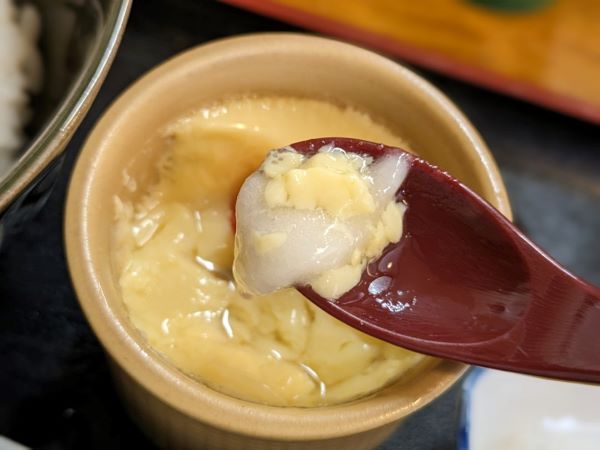添えられたポテトサラダは黄色みが強いと思ったら、卵の味が先にくる贅沢な濃厚さ♪茶わん蒸しは甘めの出汁が優しいお味です。そしてすくってみたらビックリ!お餅が出てきました~!