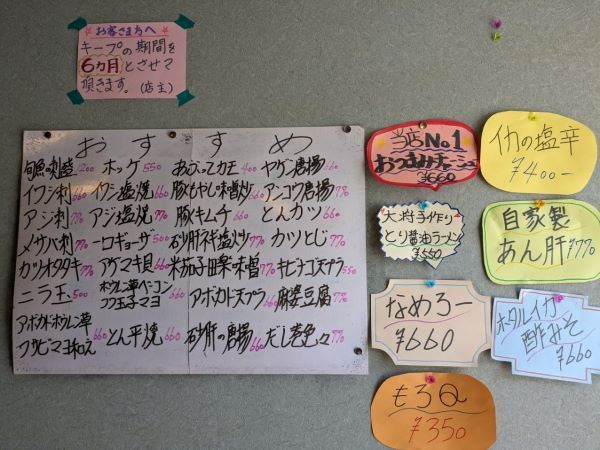毎日長浜市場から新鮮な食材を調達し、長年お寿司屋さんで修業されていた経験を活かしたお料理を提供しています。定番以外にもご覧の通り、メニューが豊富です。