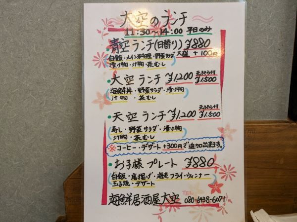 店主の大介さんの「大」、3人目の息子さんが生まれたら「空」君にしようと思っていたそうで、合体させて「大空」というお店を昨年4月にオープンしました。 ランチのメニューは、こちらの3種類+お子様プレートです。