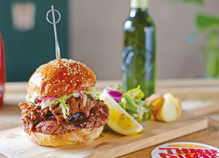 「肉を食べるためのハンバーガー」がコンセプト。こだわりのパティは、粗めにひいた牛肉を鉄板に押し付けて焼き上げる“スマッシュバーガー”スタイル。ホロホロに煮込んだ豚肉をほぐして、パティ、コールスローとともにふわふわのバンズにサンドした「プルドポークバーガー」(1,600円)で、牛肉×豚肉のコラボを楽しんで。