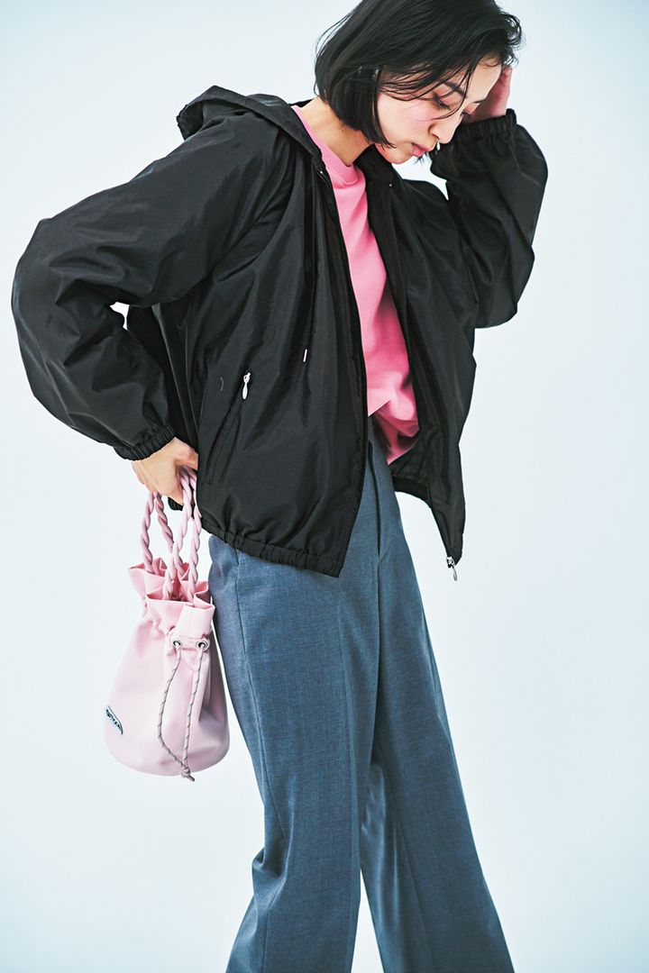 ピンクTもシャカブルゾンを味方にすれば、甘すぎない。ショート丈だからワイドパンツを合わせてもスタイル良く見せてくれます。ブルゾンはユナイテッドアローズ、スウェットはアンヌ、パンツはカオス、バッグはアウトドアプロダクツのもの。