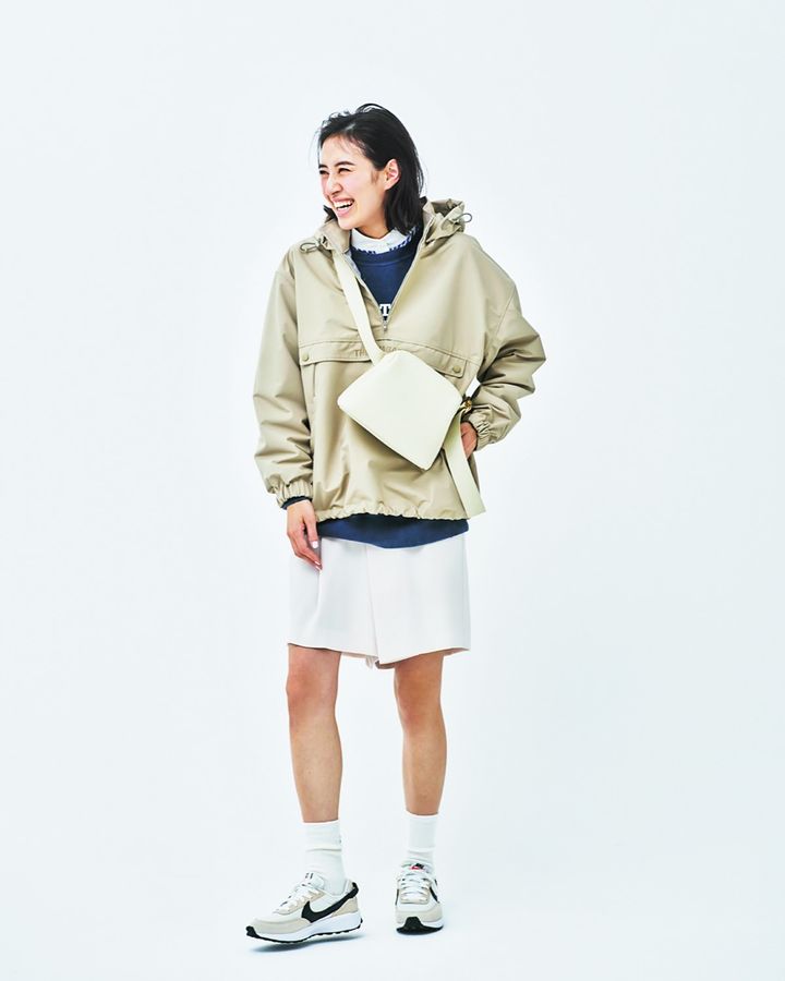 白いハーフパンツが爽やか。首元や裾からインナーをしっかり見せることでオシャレ度が上がります。アウターはサードマガジン、ハーフパンツはハイク、バッグはオソイ、スニーカーはナイキのもの。