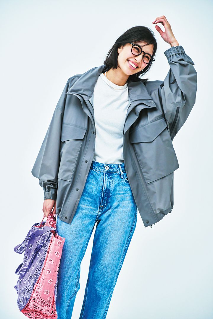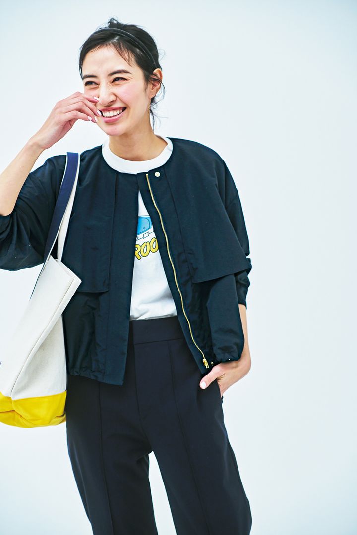 ポップなカラーを取り入れたコーデも、ノーカラーのブルゾンで品良くまとまります。ブルゾンはアンフィーロ、Tシャツはバッシャバ、パンツはエーケー ワン、バッグはチャンピオンのもの。