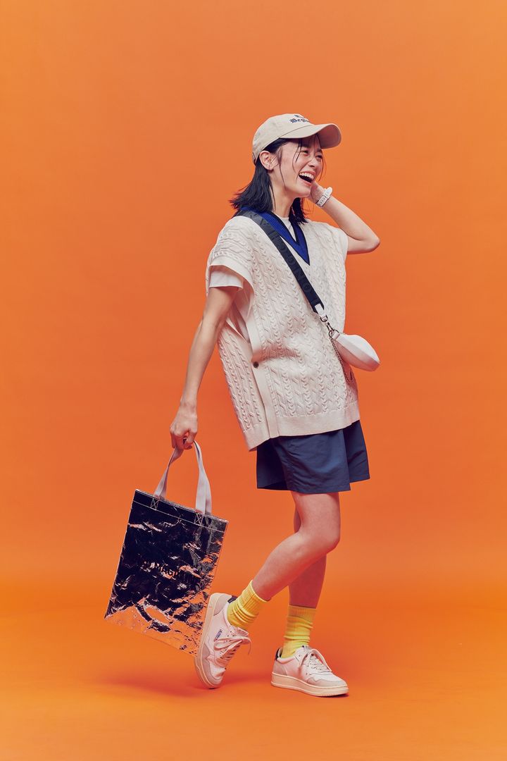 体型カバーもしてくれそうなビッグニットベストで上半身にボリュームを持たせれば、下半身の華奢見え効果をアップ。ハーフパンツはナイキ、ベストはトラディショナル ウェザーウェア、スニーカーはオートリー、ポシェットはロンシャン、トートバッグはサードマガジン、キャップはオブラダのもの。