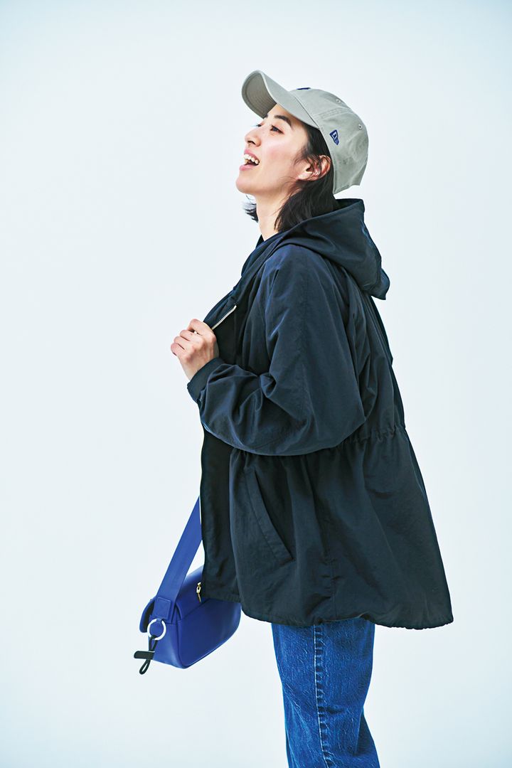 アウトドア感たっぷりのアウターは、ネイビーを選ぶのも手。デニム&キャップのカジュアルも落ち着いた雰囲気に。ブルゾンはグリーンレーベル リラクシング、パンツはアッパーハイツ、キャップはニューエラ、バッグはロンシャンのもの。