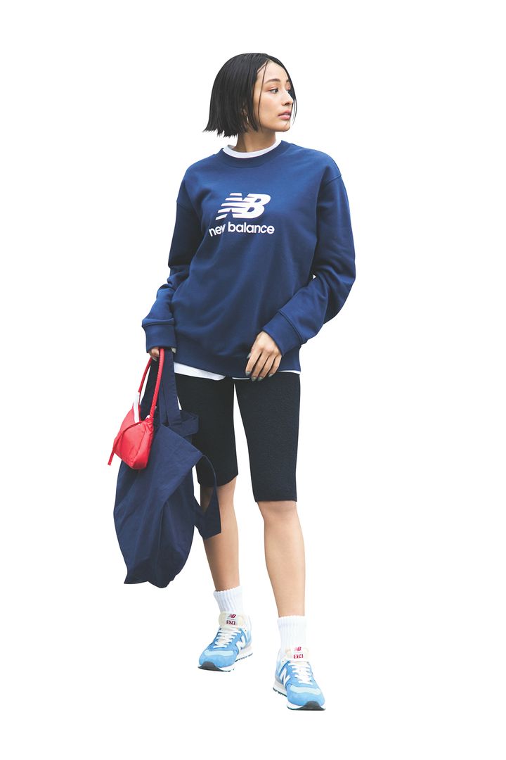 スパッツ風のハーフパンツとロゴスウェットを合わせた、振り切ったアウトドアスタイル。運動会や公園などアクティブシーンだなら、動きやすいほうがいい!と割り切って挑戦できそう。パンツはフィーニー、スウェットとスニーカーはニューバランス、バッグはコキヨ、トートバッグはサンディニスタのもの。