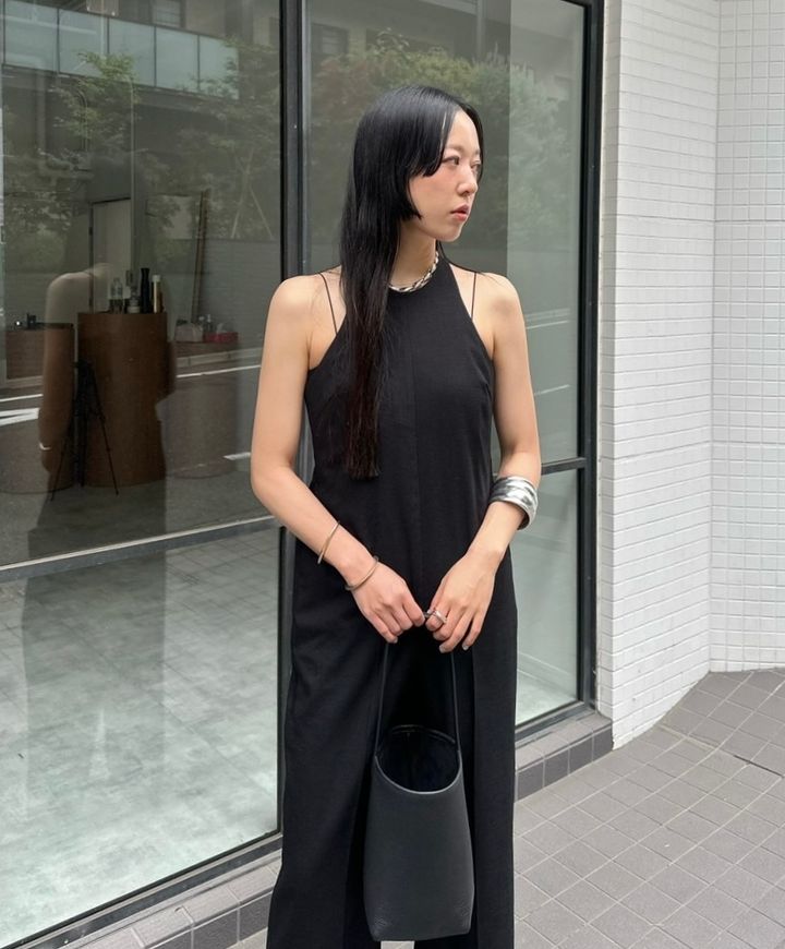 「アメスリで女っぽくモードな印象のオールインワンは、デザイン性はありつつもシンプルなので存在感のあるアクセサリーをつけてコーディネートしたのがポイント。重い印象にならないように足元はオープンスクエアトウで肌を程よく見せ、ヌケ感を出しました。バッグは表面にシボ感のあるものを合わせて、のっぺりしないようにバランスよくまとめました」