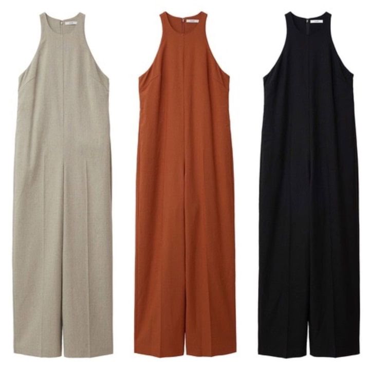 サラッと落ち感のある生地とセンタープレス入りのデザインで、スッキリとしたシルエットに。轡田さんの着用しているブラックのほか、ベージュとオレンジの3色展開。オールインワン各¥28,600(全てクラネ)