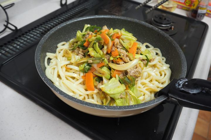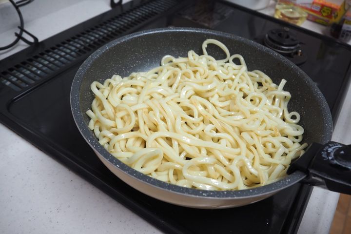 炒めた野菜と肉は一旦皿に取り出し、フライパンでうどんを炒めます。