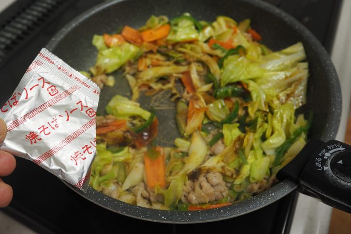 うどんに焼き色がついたら、野菜と肉をフライパンに戻します。後はソース粉で味付けすれば出来上がり。うどん1玉に対し、ソース粉は1袋使いました。