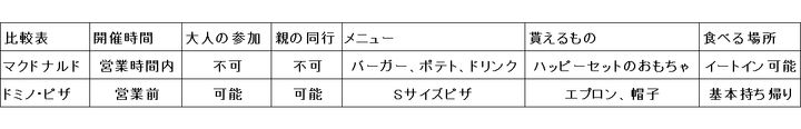子どもが本物のお店でお店屋さん体験をするということで、似ていると思ったのはマクドナルドです。お店によって対応は違うと思いますが、参考までにわが家の子どもが体験したマクドナルド(クルー体験)とドミノピザ(ピザアカデミー)の比較は下記の通りです。