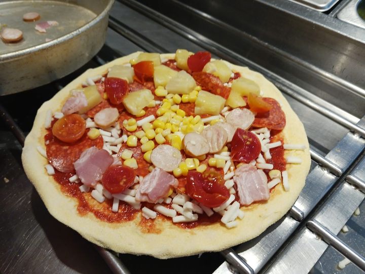 まずは、ピザ生地作り。ふっかふかの生地にコーンの粉をかけて伸ばしていきます。そして生地が伸びたら、トマトソースを塗ります。次に、測りながらチーズをのせます。最後に、お楽しみの具をのせます。具を好き放題にのせさせてもらい、子どもたちは満足そうでした。最後にオーブンのなかをピザが通ったら、ピザは完成です!