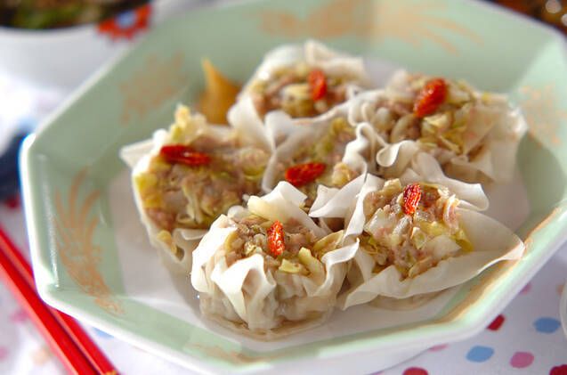 みじん切りにしたキャベツをたっぷり入れたヘルシーなシューマイです。みじん切りにしたキャベツは抗菌袋に入れ、塩を振って少しもみ、余分な水分をしっかりしぼってからひき肉と混ぜていきましょう。