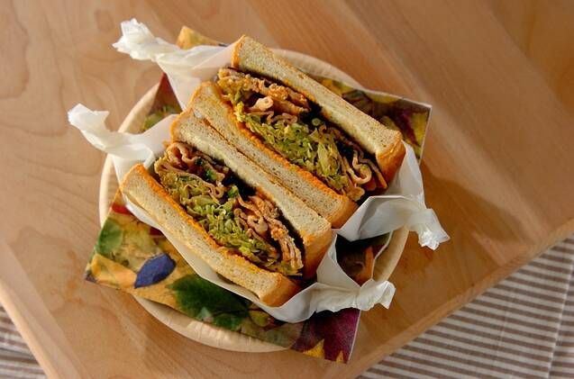 千切りにしたキャベツをマヨネーズとコチュジャンで和え、甘辛く味付けしたひき肉とパンに挟んで韓国風のサンドイッチに仕上げました。キャベツは食べる直前に和えるのがポイントです。サンドイッチの切り口が美しい萌え断レシピ。