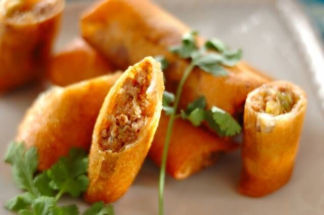 キャベツとひき肉をオイスターソースやしょうゆ、みりんなどでしっかり味をつけ、春巻きの皮で巻いて揚げたごちそうレシピ。酢じょうゆだけでなく、スイートチリソースで食べるのもオススメです!