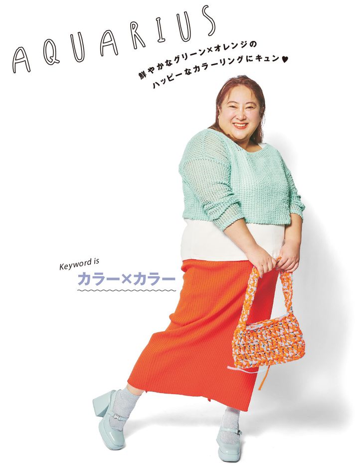 グリーンもオレンジもハッピー感ある色なので、合わせるとより幸せ度が強化! 全体的にうるさくならないように白を挟んだり、透け感のある素材を選ぶとまとまりもよく♥